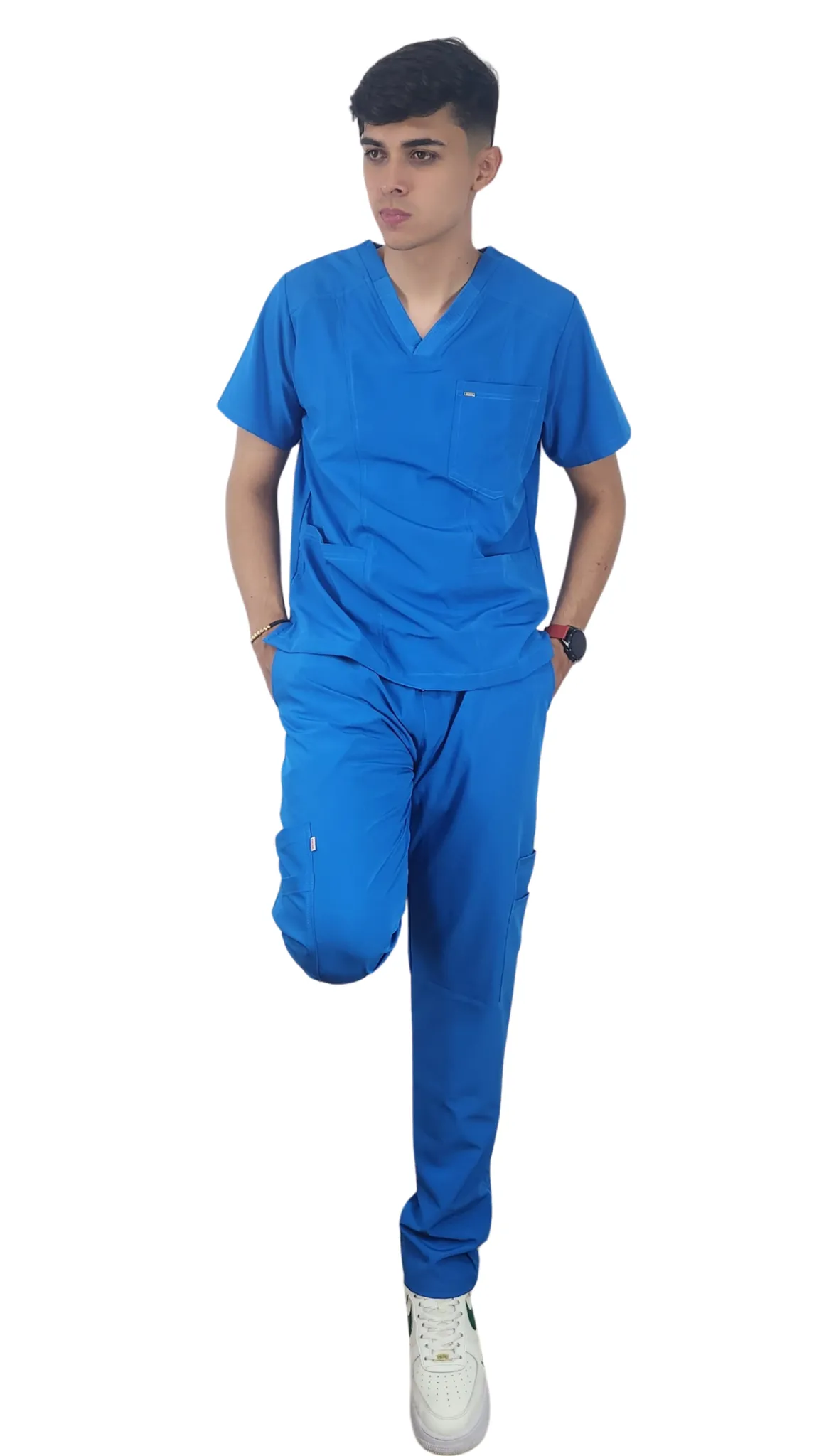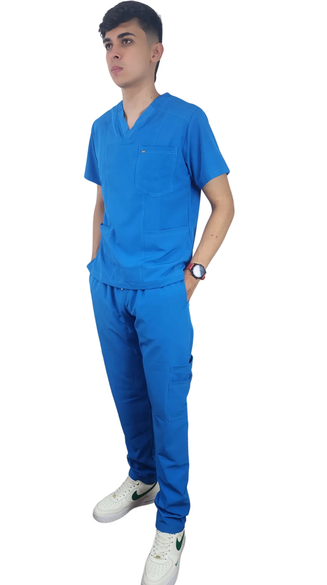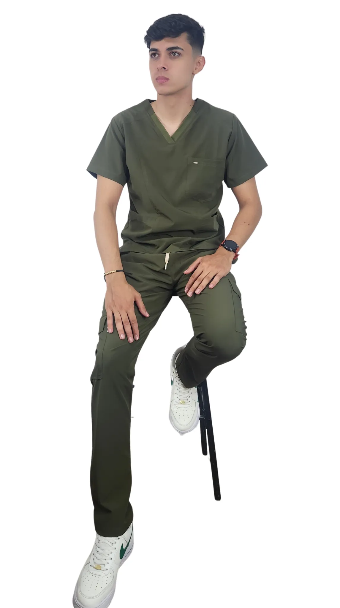 Uniforme cuello en v con Rif de poliéster en cuello, bolsillo pequeño en la parte superior e inferior de la camisa, Pretina de pantalón de 3 cm cordón en poliéster y puntera en zama con bolsillos camuflado a un costado, bota recta.