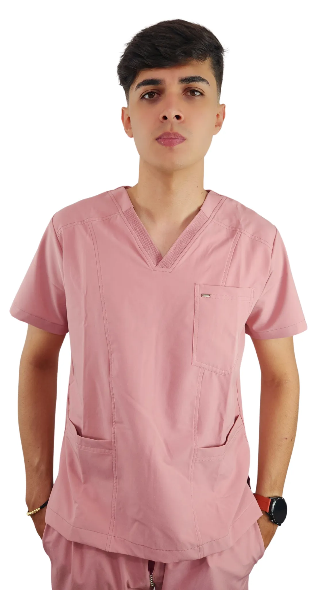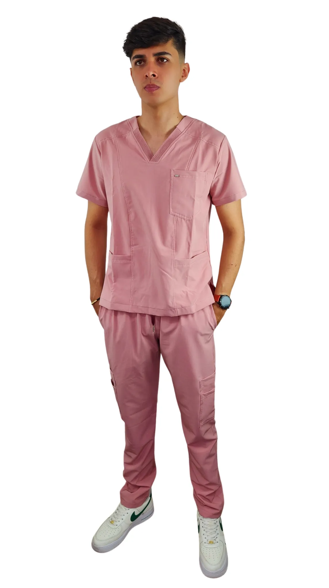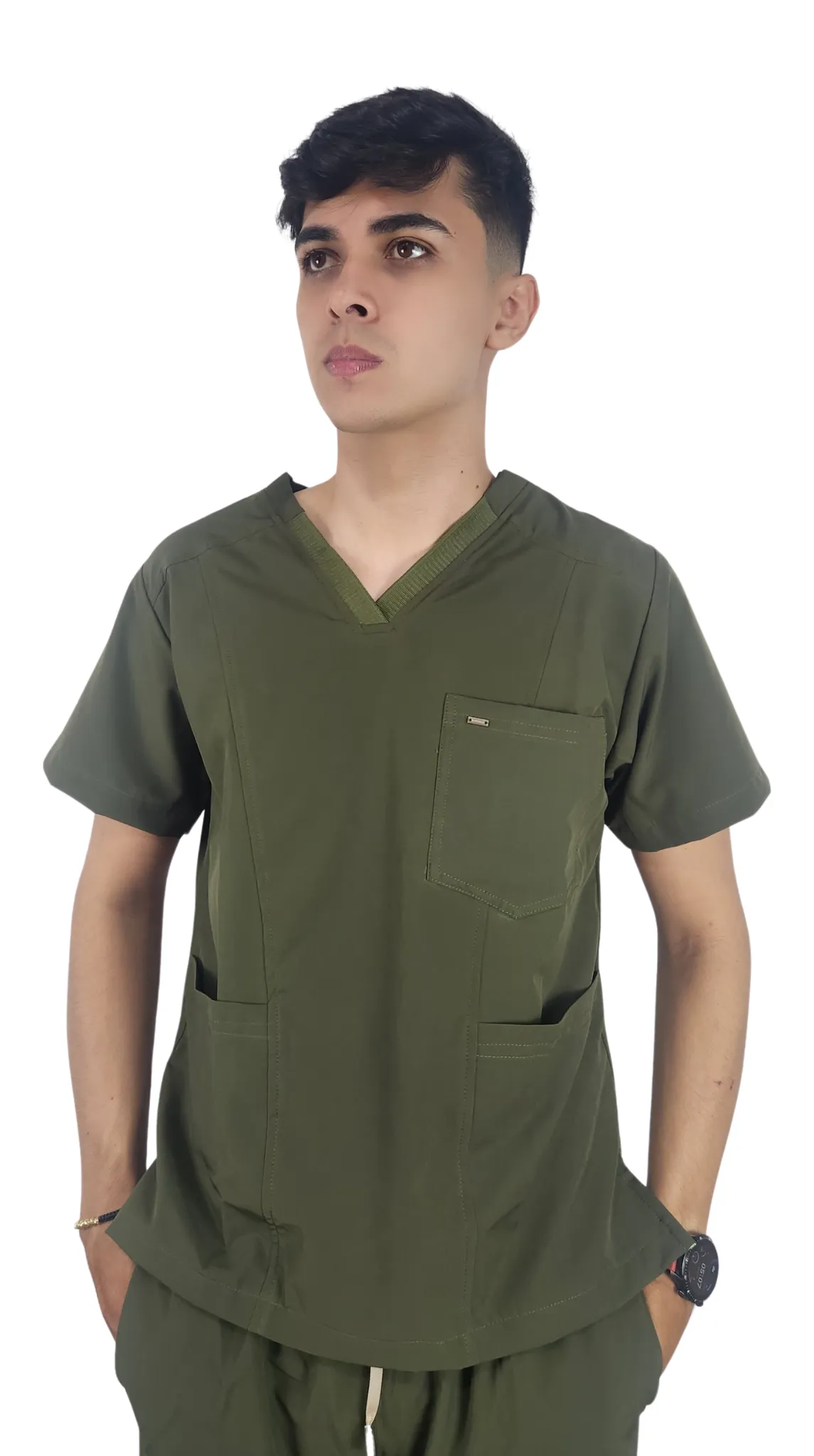 Uniforme cuello en v con Rif de poliéster en cuello, bolsillo pequeño en la parte superior e inferior de la camisa, Pretina de pantalón de 3 cm cordón en poliéster y puntera en zama con bolsillos camuflado a un costado, bota recta.