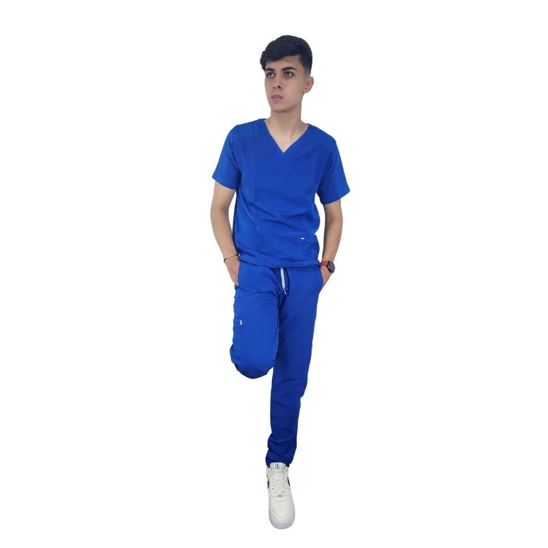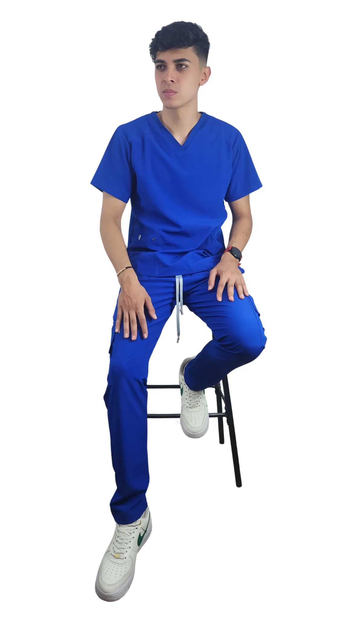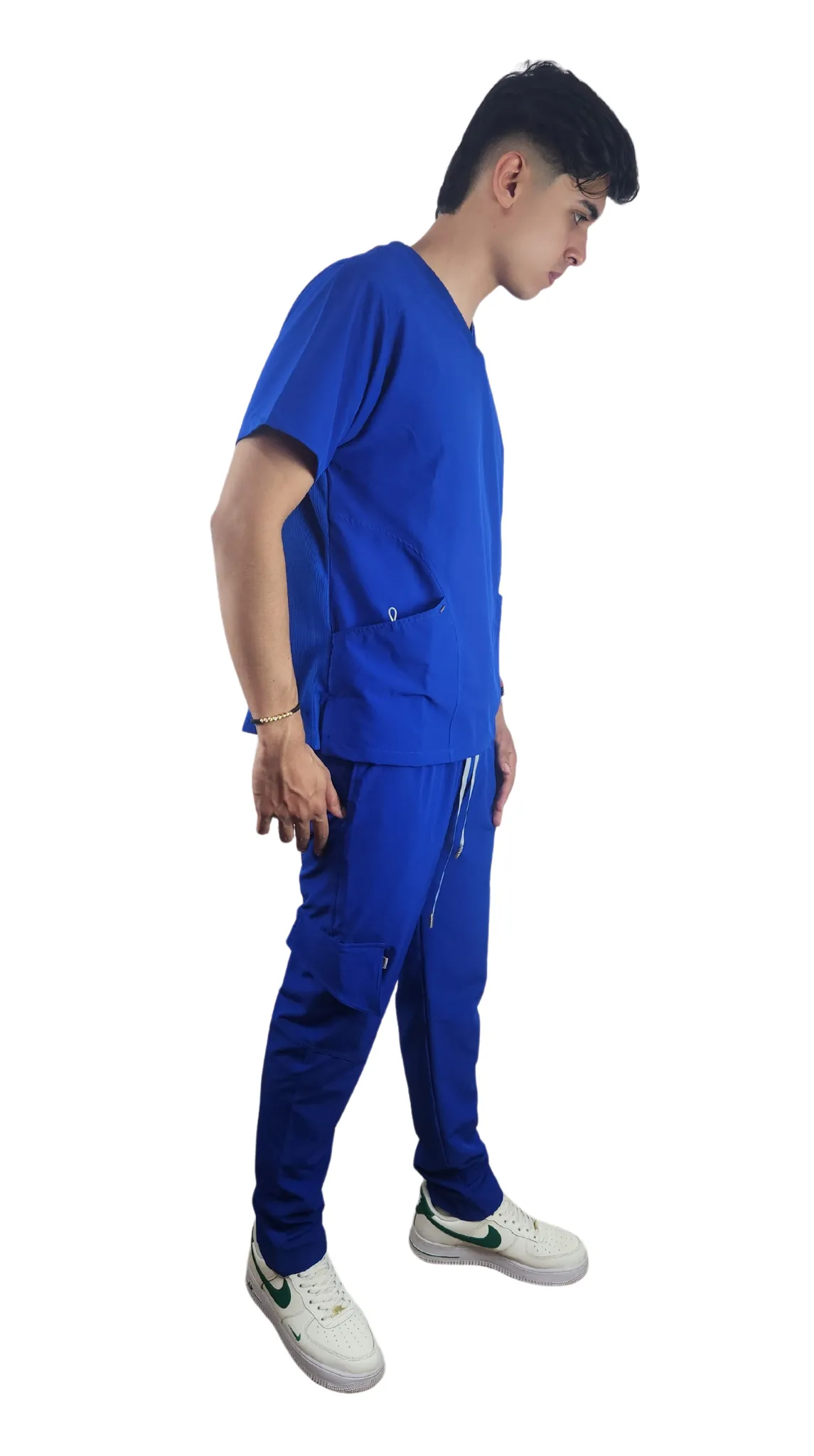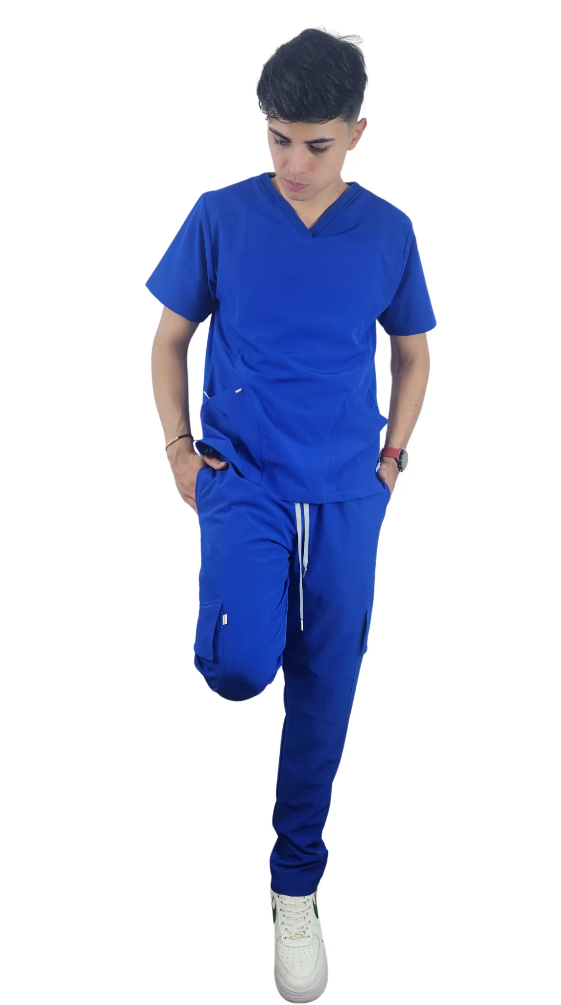 Uniforme cuello en v tipo deportivo con Rif de poliéster en cuello,dos bolsillo en la parte de inferior de la blusa. Pretina de pantalón de 3 cm cordón en poliéster y puntera en zama con bolsillos camuflado con tapa a un costado.