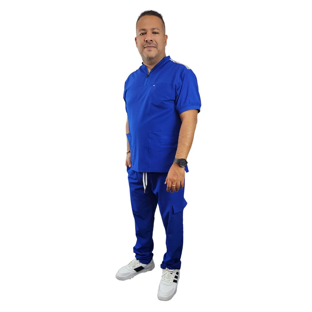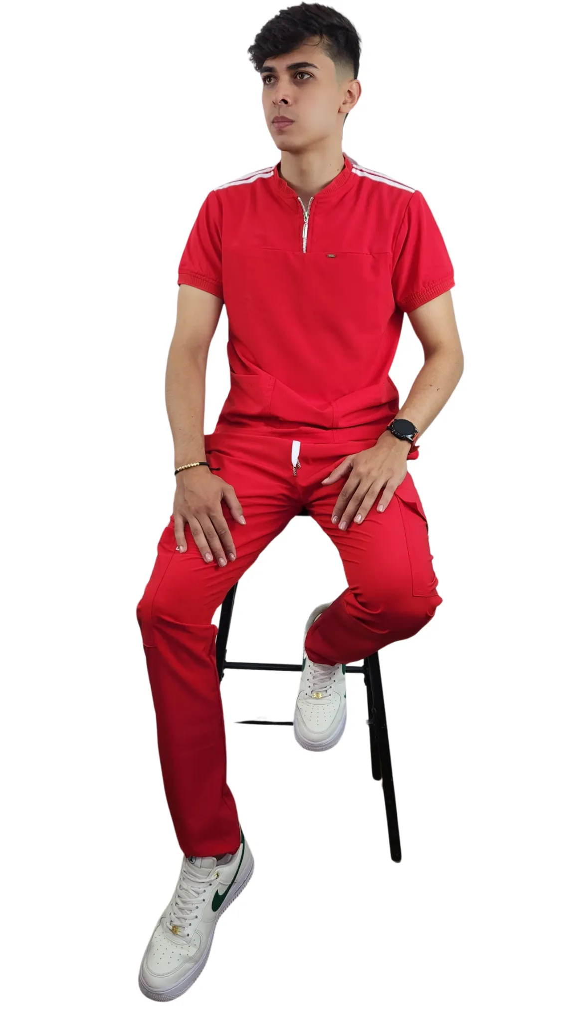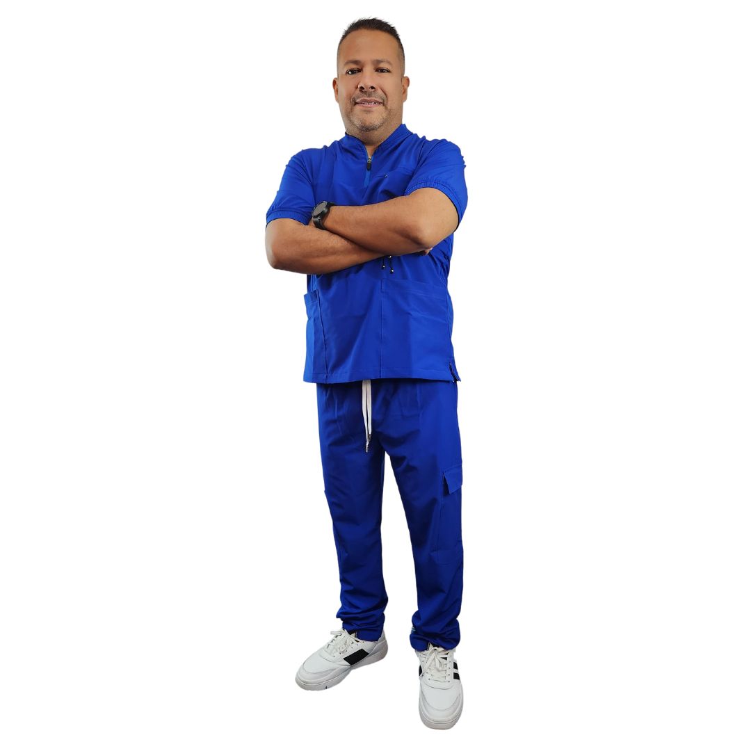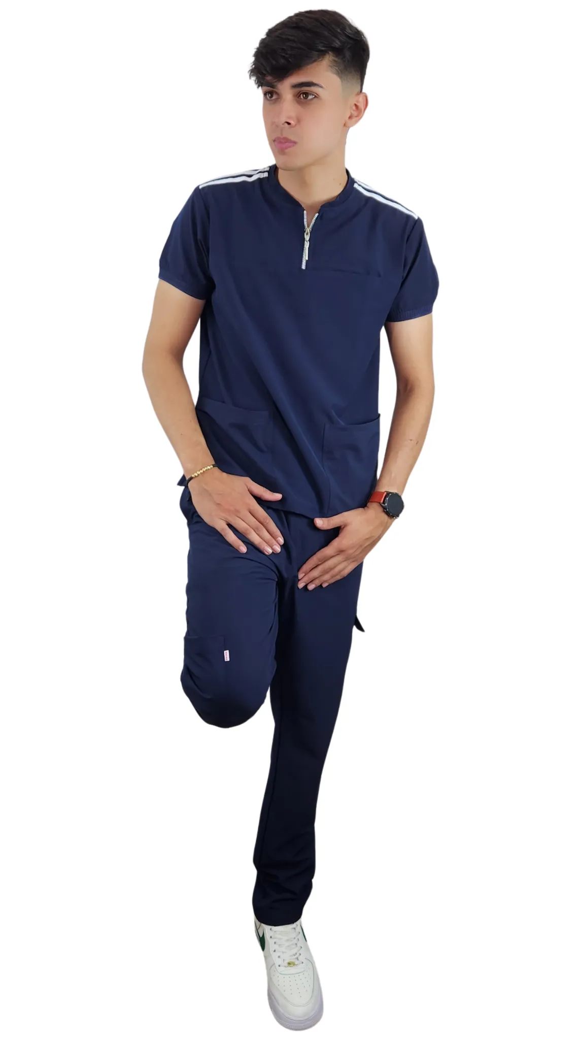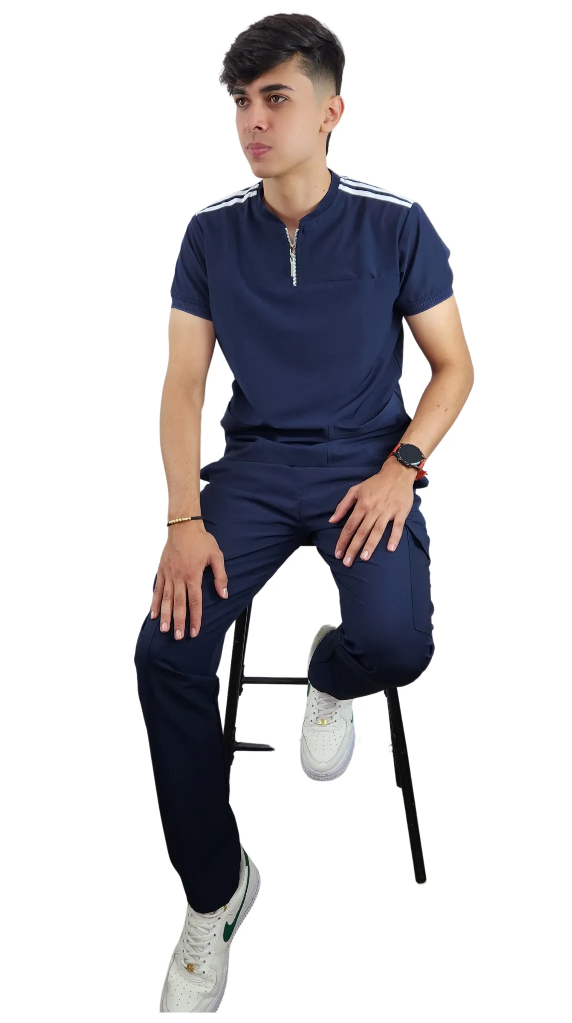 Uniforme cuello en v tipo deportivo con Rif de poliéster en cuello y puño, bolsillo escondido en la parte de arriba de la blusa, cierre color plateado en la parte superior de la blusa lleva tres lineas blancas. Pretina de pantalón de 3 cm cordón en poliéster y puntera en zama con bolsillos camuflado a un costado, bota recta