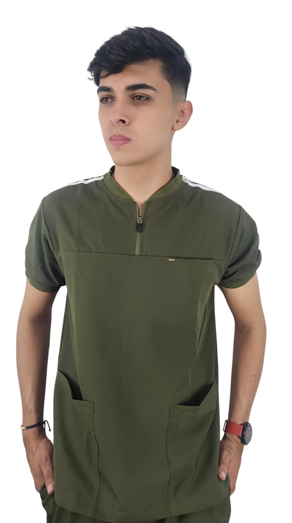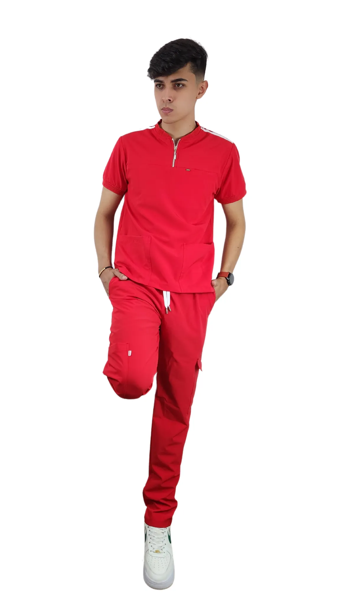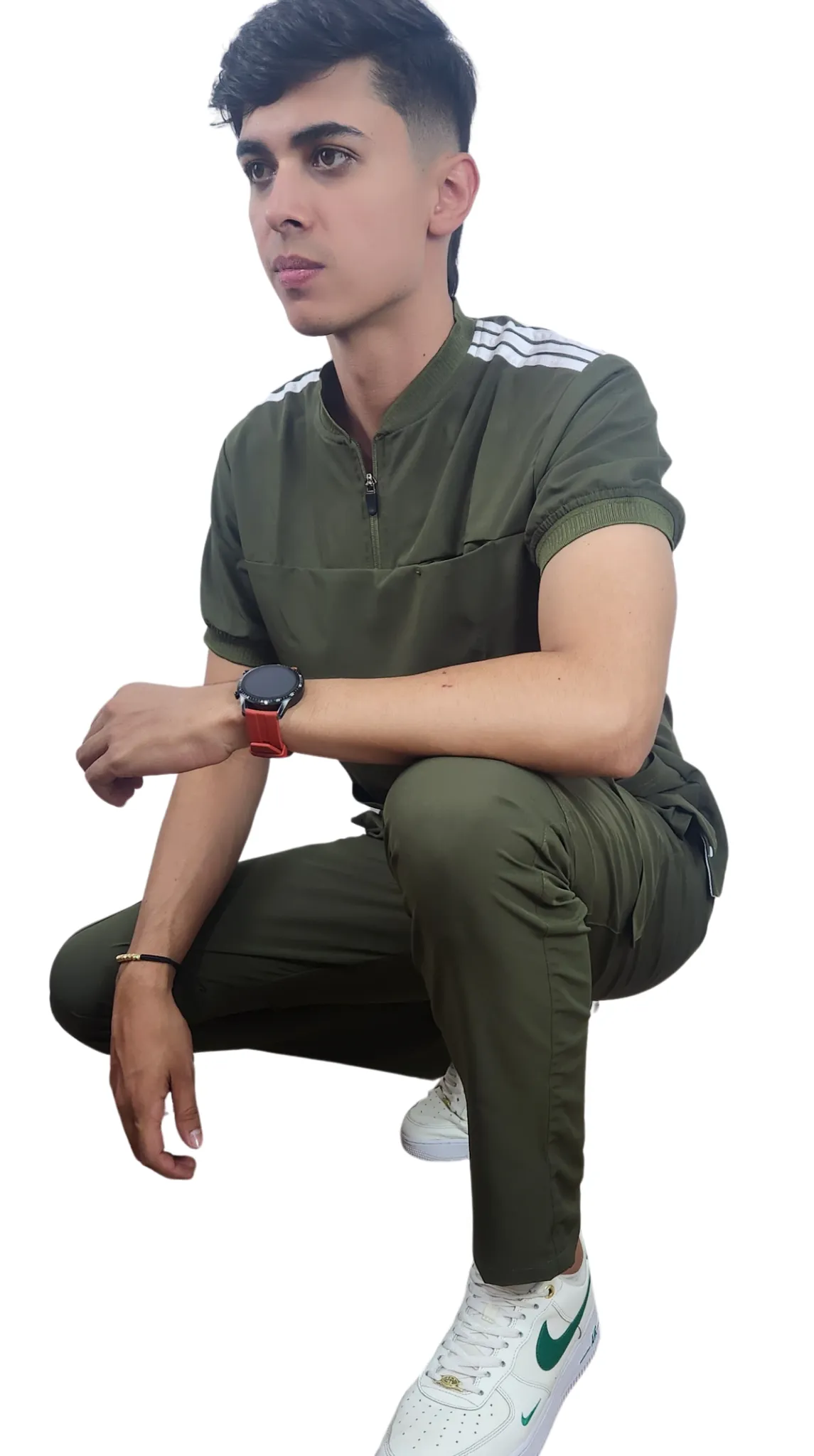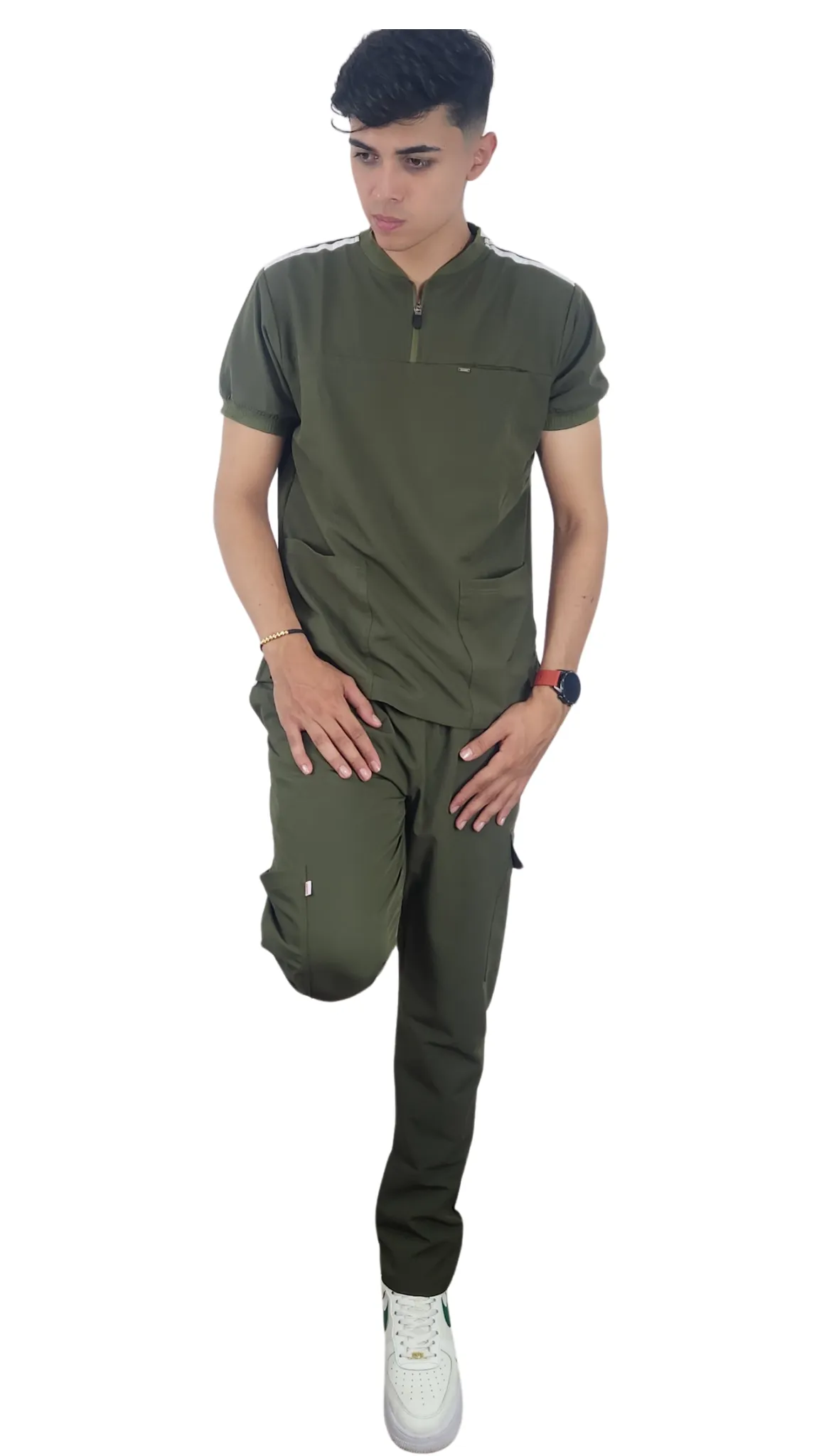 Uniforme cuello en v tipo deportivo con Rif de poliéster en cuello y puño, bolsillo escondido en la parte de arriba de la blusa, cierre color plateado en la parte superior de la blusa lleva tres lineas blancas. Pretina de pantalón de 3 cm cordón en poliéster y puntera en zama con bolsillos camuflado a un costado, bota recta
