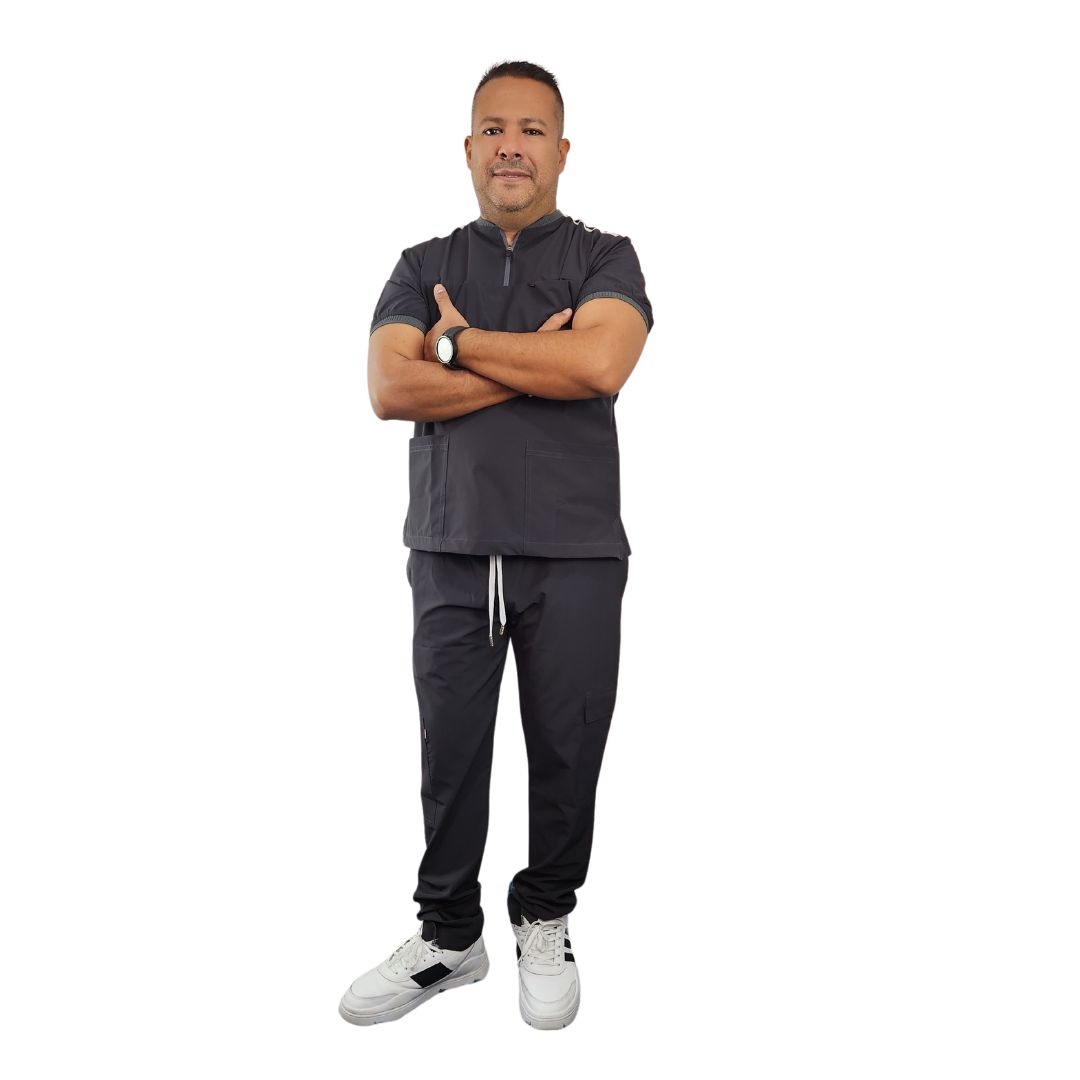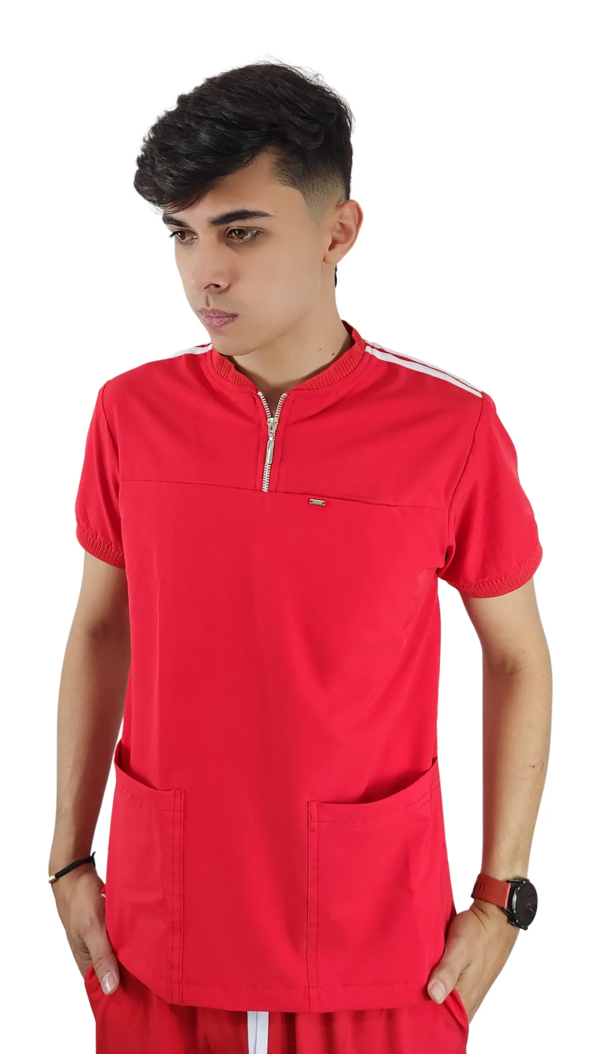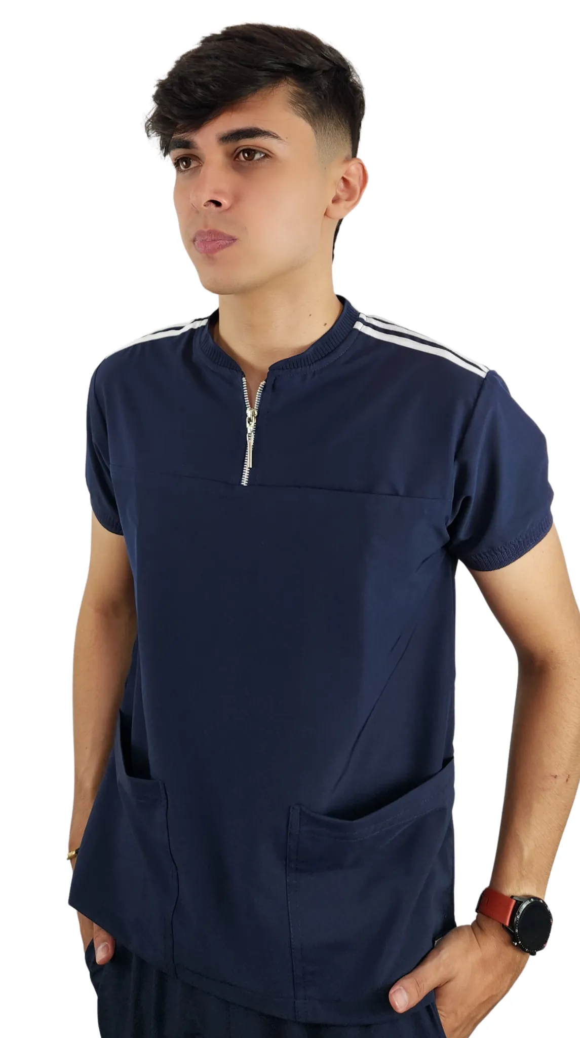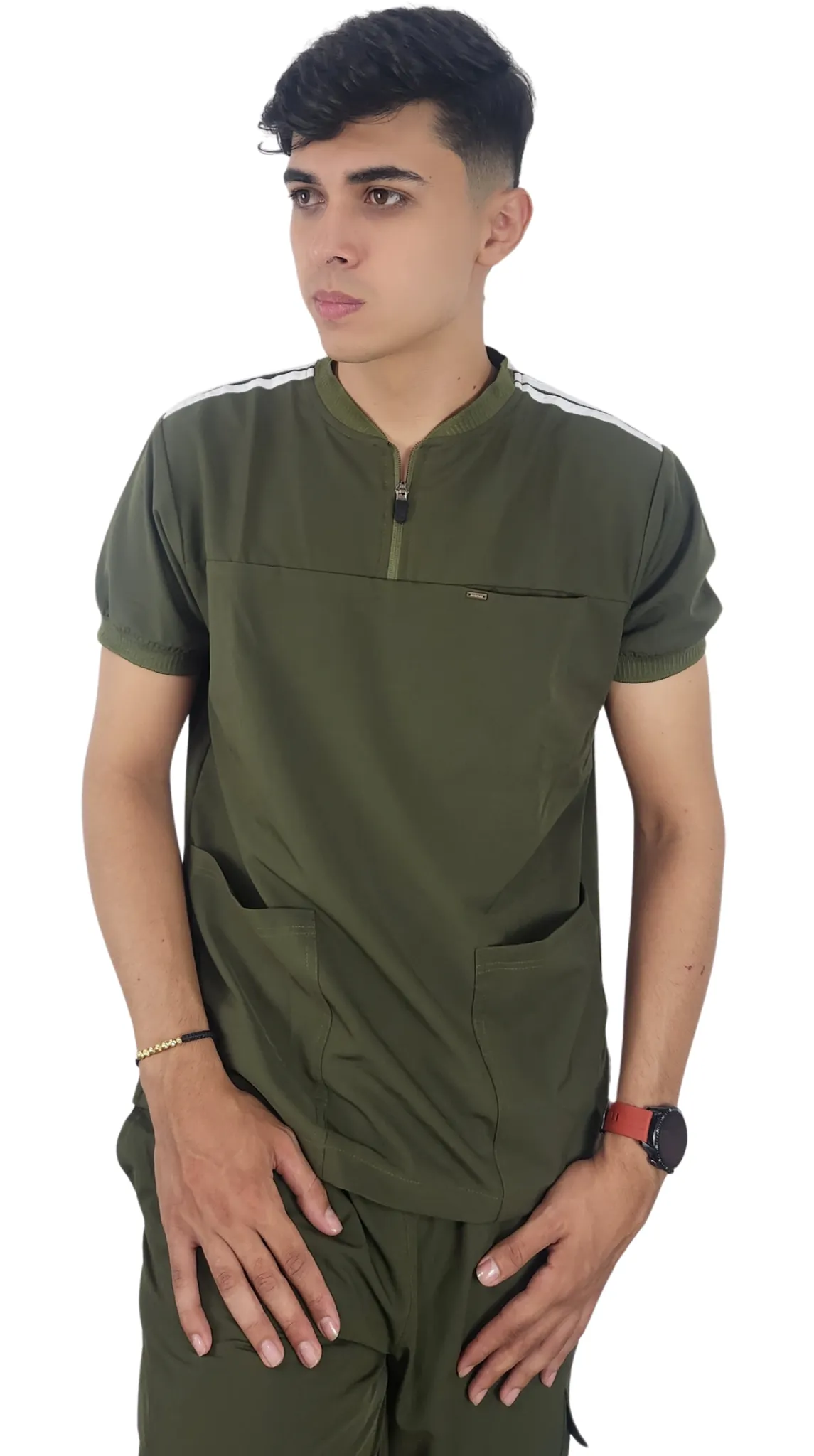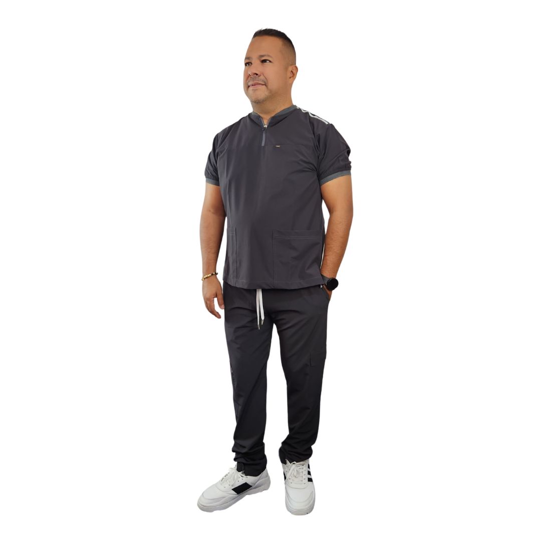 Uniforme cuello en v tipo deportivo con Rif de poliéster en cuello y puño, bolsillo escondido en la parte de arriba de la blusa, cierre color plateado en la parte superior de la blusa lleva tres lineas blancas. Pretina de pantalón de 3 cm cordón en poliéster y puntera en zama con bolsillos camuflado a un costado, bota recta