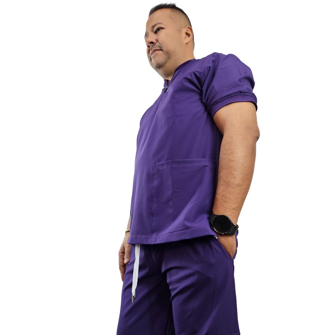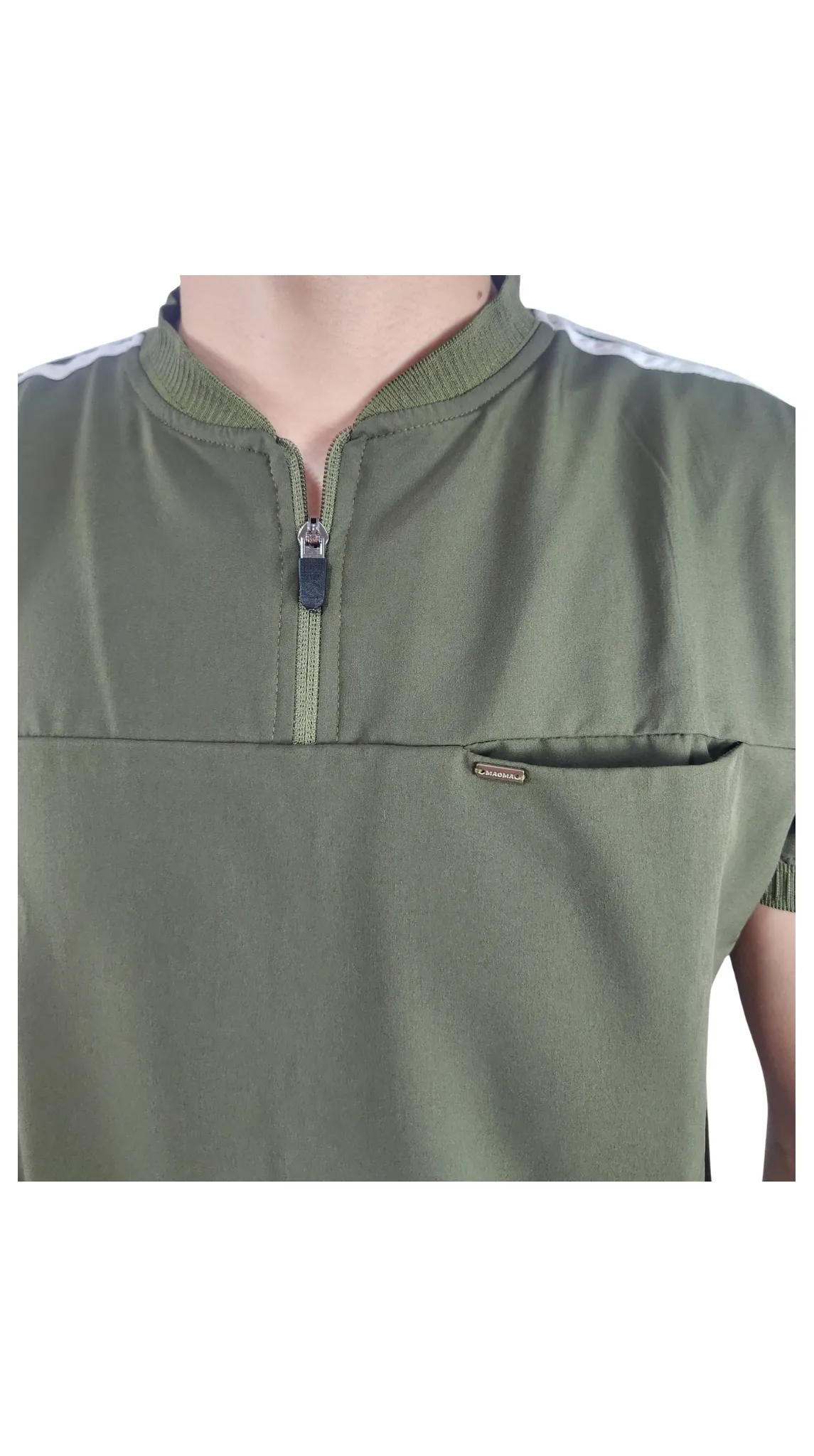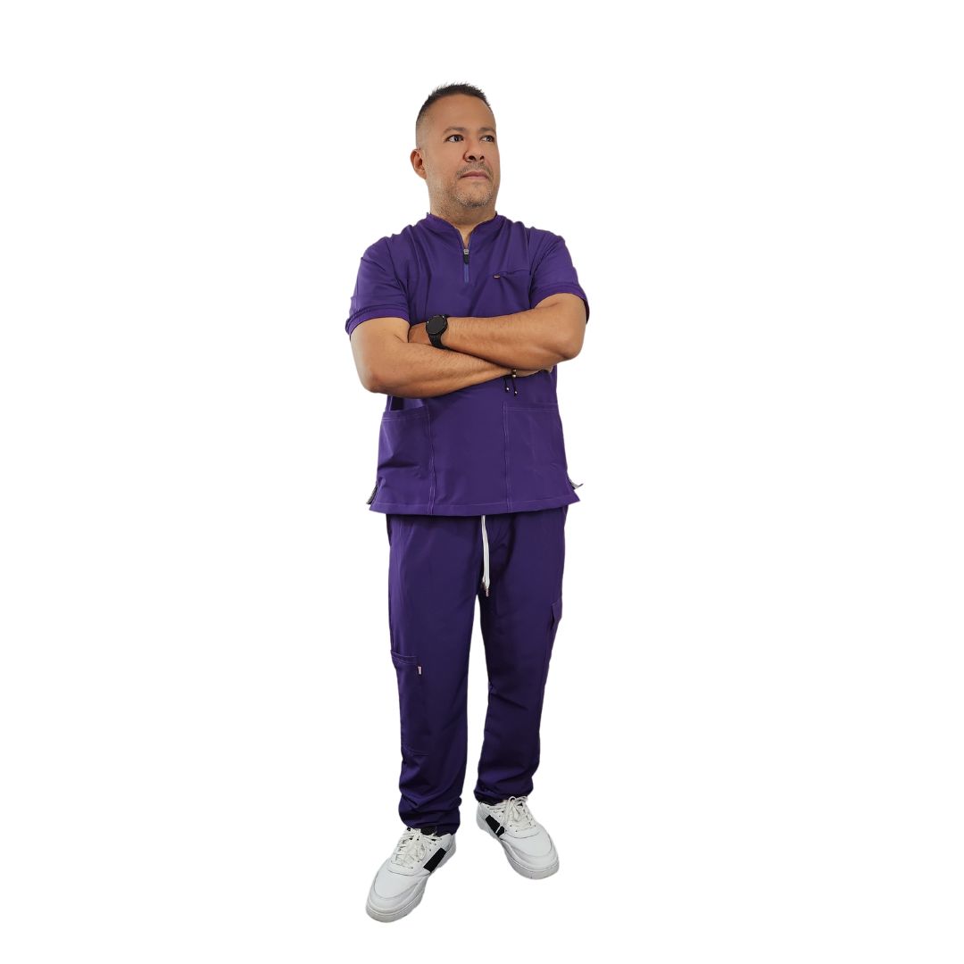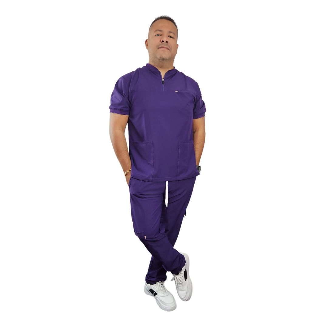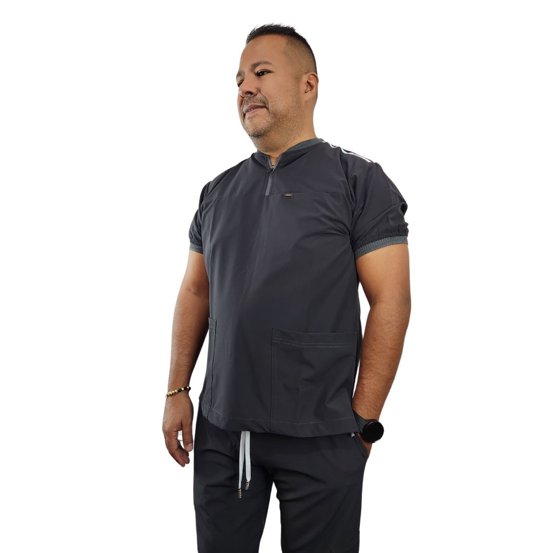 Uniforme cuello en v tipo deportivo con Rif de poliéster en cuello y puño, bolsillo escondido en la parte de arriba de la blusa, cierre color plateado en la parte superior de la blusa lleva tres lineas blancas. Pretina de pantalón de 3 cm cordón en poliéster y puntera en zama con bolsillos camuflado a un costado, bota recta