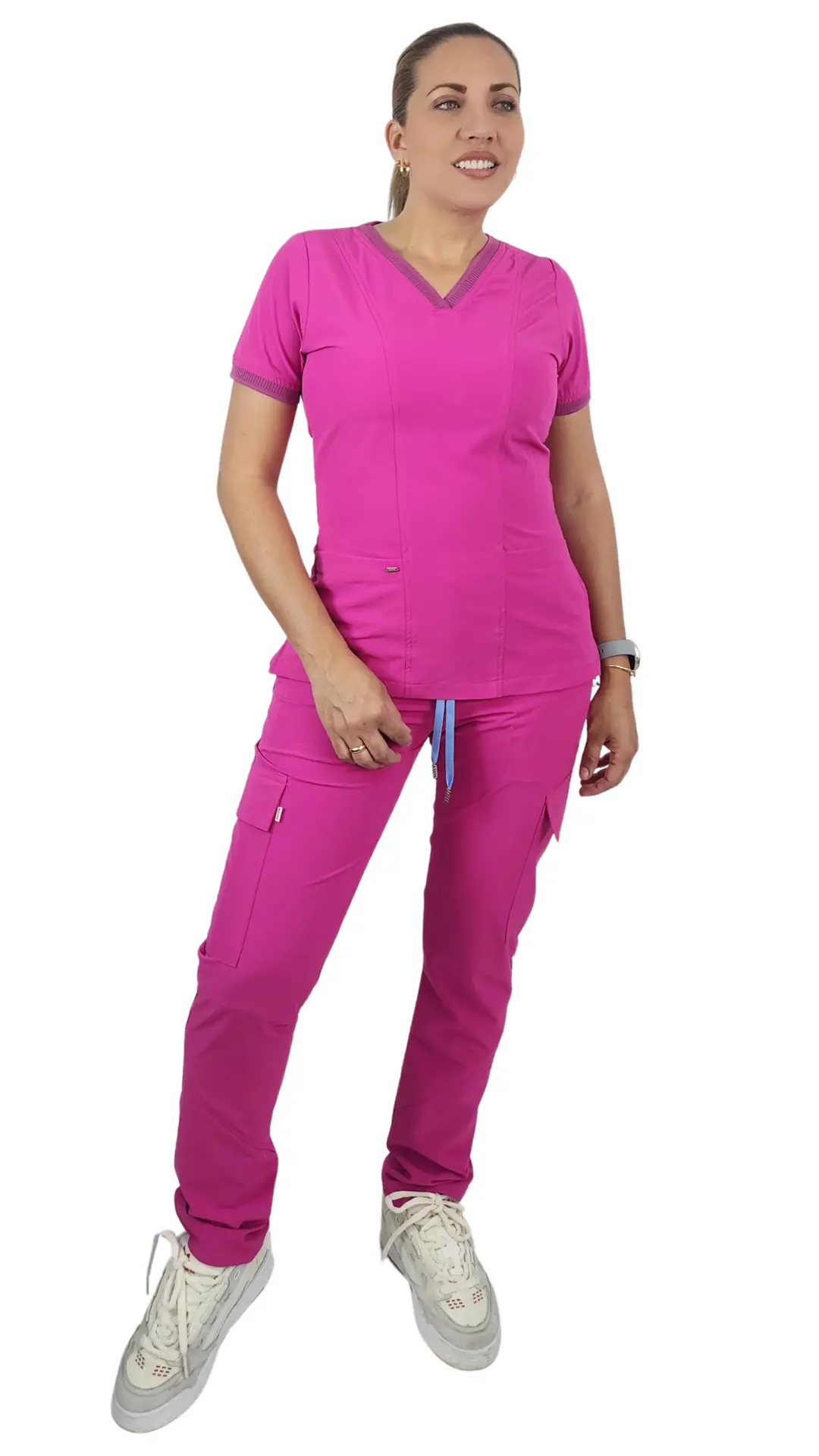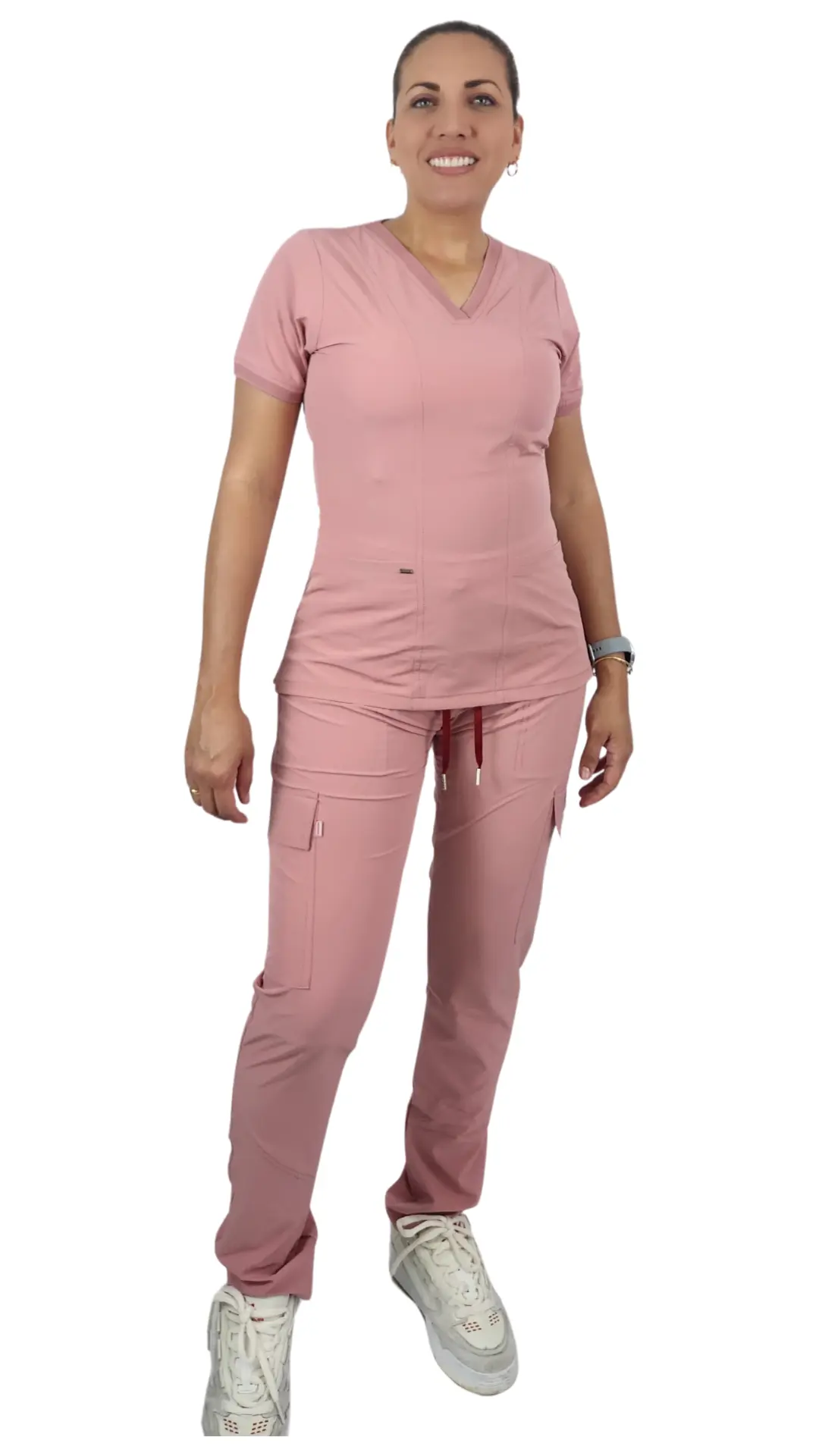 Uniforme cuello en v tipo deportivo con Rif de poliéster en cuello y puño, bolsillo pequeño en la parte de arriba de la blusa. Pretina de pantalón de 5 cm cordón en poliéster y puntera en zama con bolsillos camuflado estilo cargo a un costado y bolsillos traseros.
