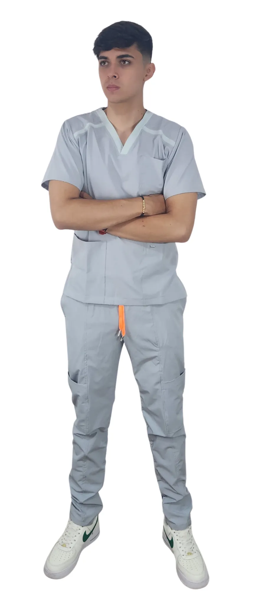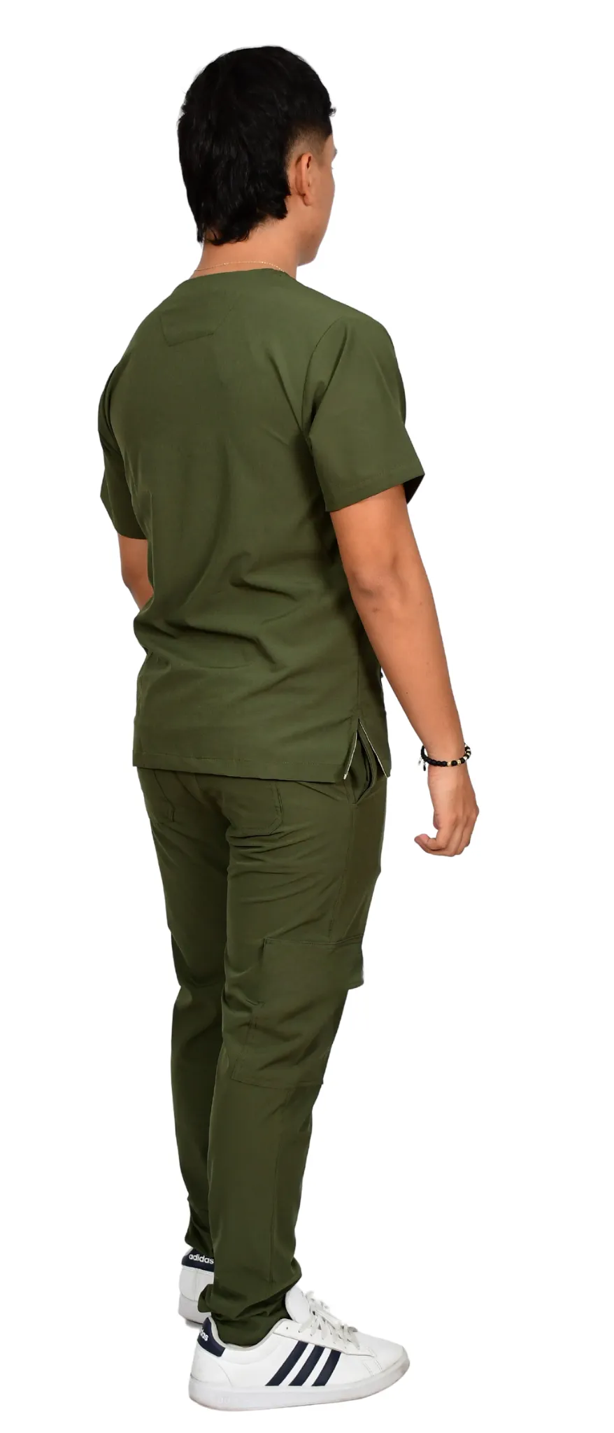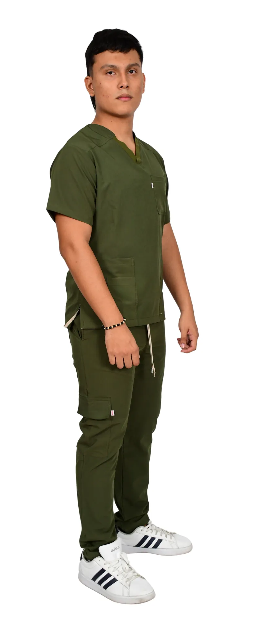 Uniforme cuello en v tipo deportivo con Rif de poliéster en cuello,bolsillo pequeño en la parte superior e inferior de la camisa, Pretina de pantalón de 3 cm cordón en poliéster y puntera en zama con bolsillos camuflado a un costado, bota recta.