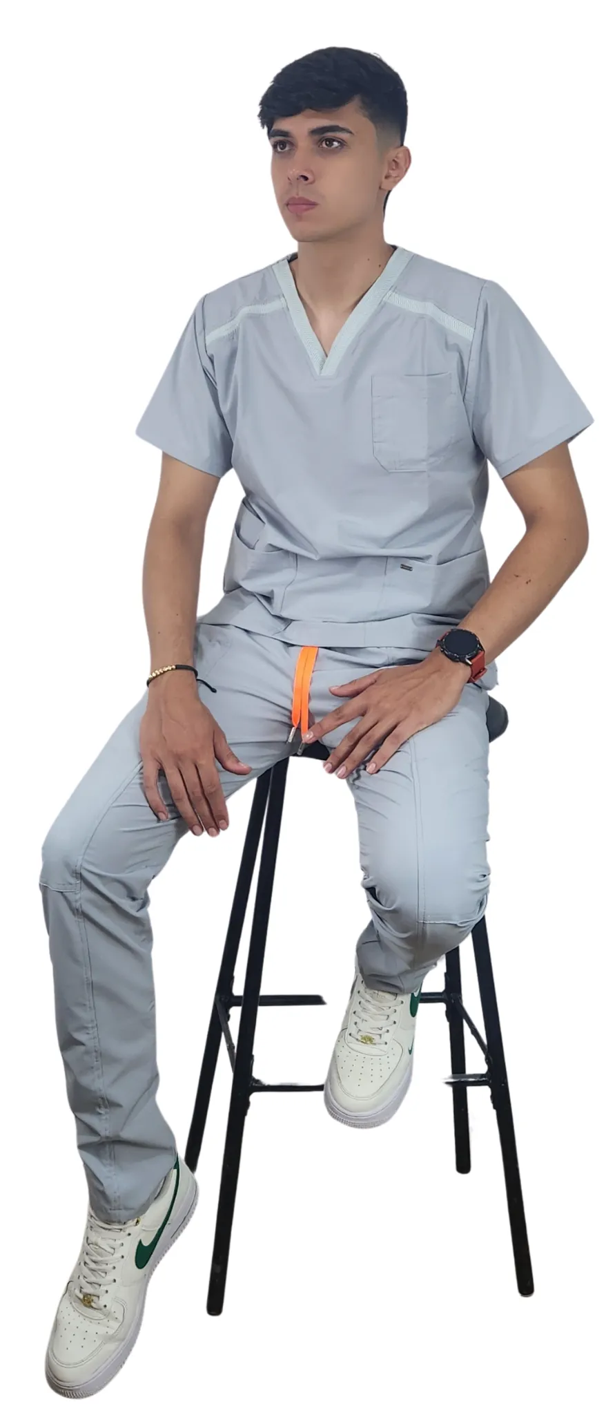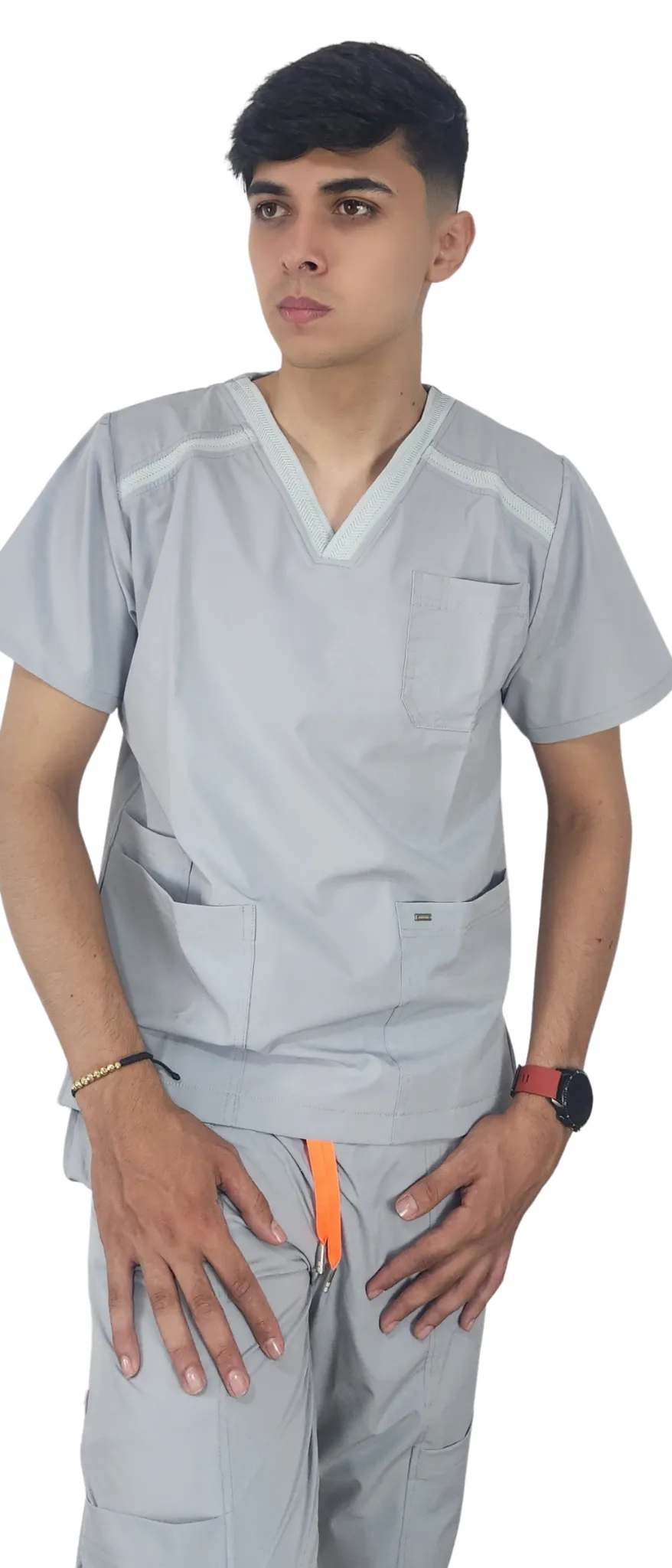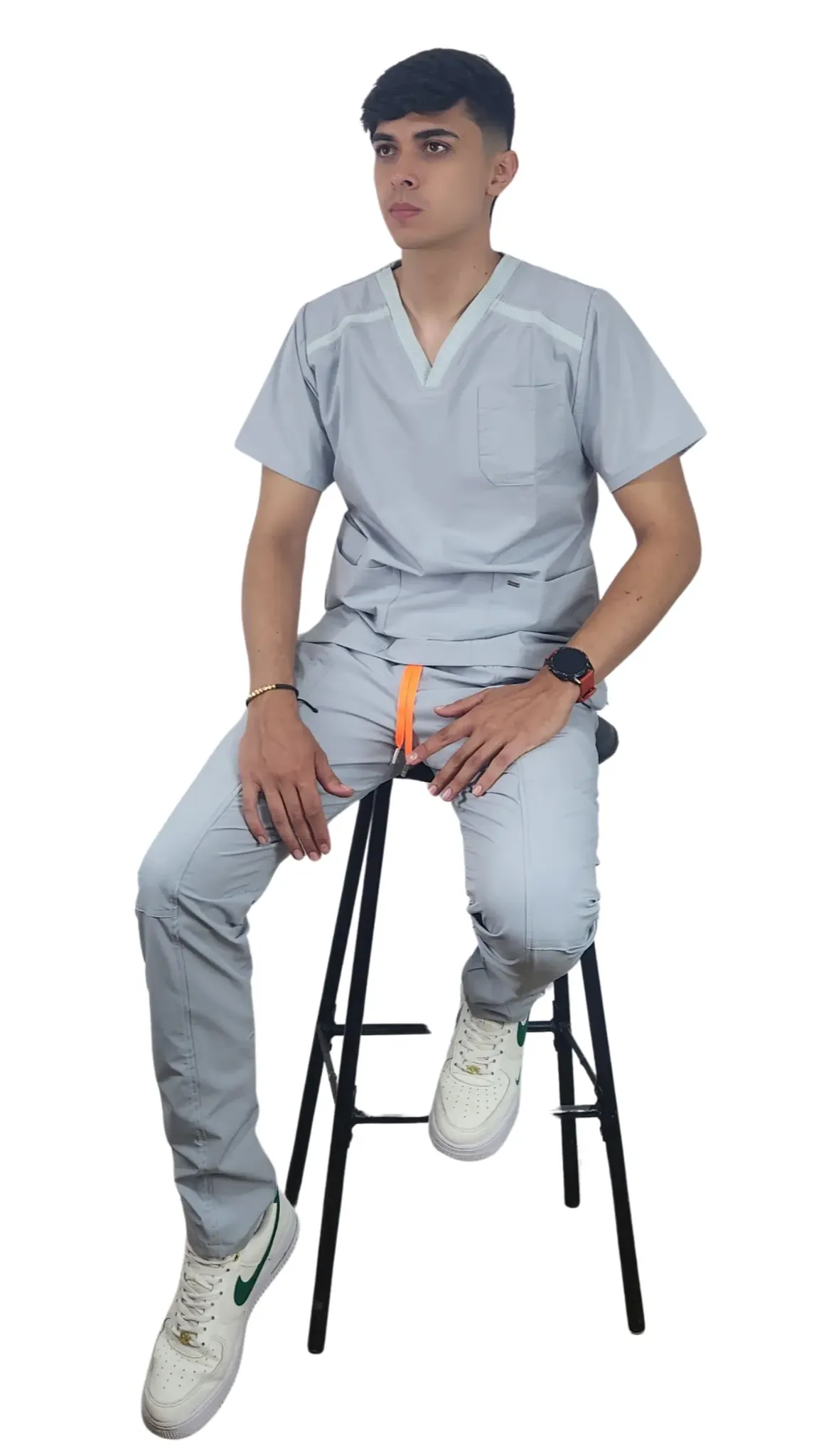 Uniforme cuello en v tipo deportivo con Rif de poliéster en cuello,bolsillo pequeño en la parte superior e inferior de la camisa, Pretina de pantalón de 3 cm cordón en poliéster y puntera en zama con bolsillos camuflado a un costado, bota recta.